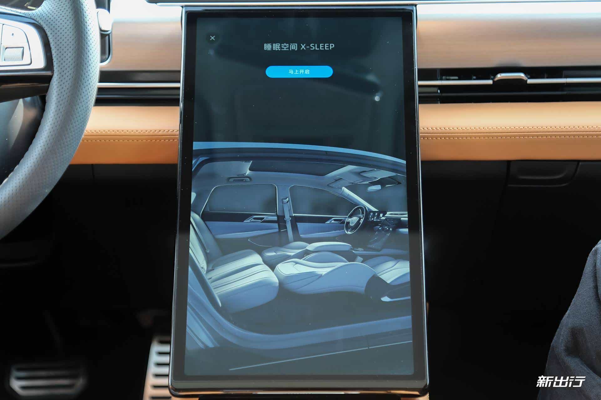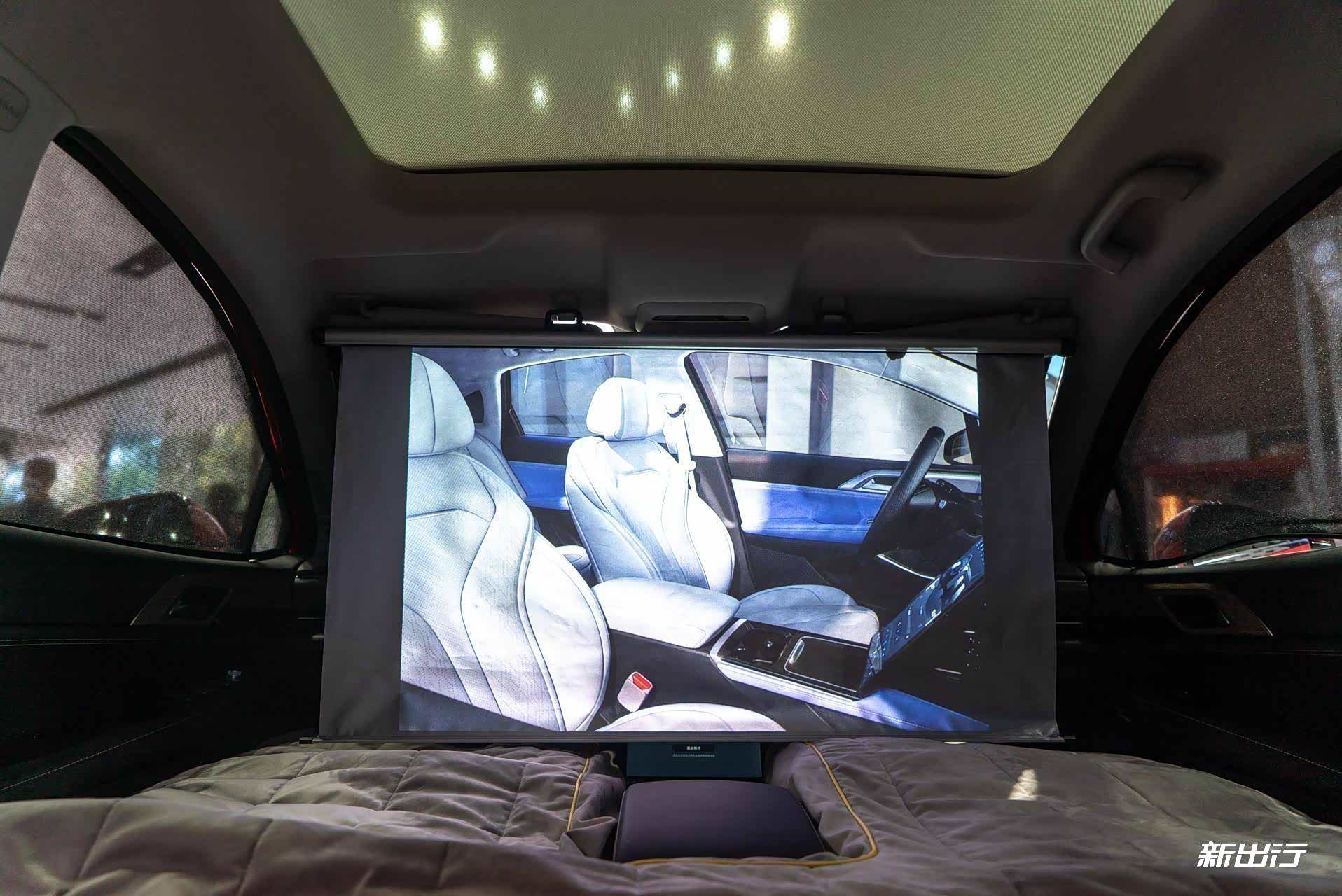可以通过中控屏或语音进入睡眠空间模式,但切记要保证前排两个头枕都已经取下。在进入睡眠空间后,前排座椅会自动放倒,此时再加上官方配备的充气床垫,就能真正成为一个睡眠空间了。