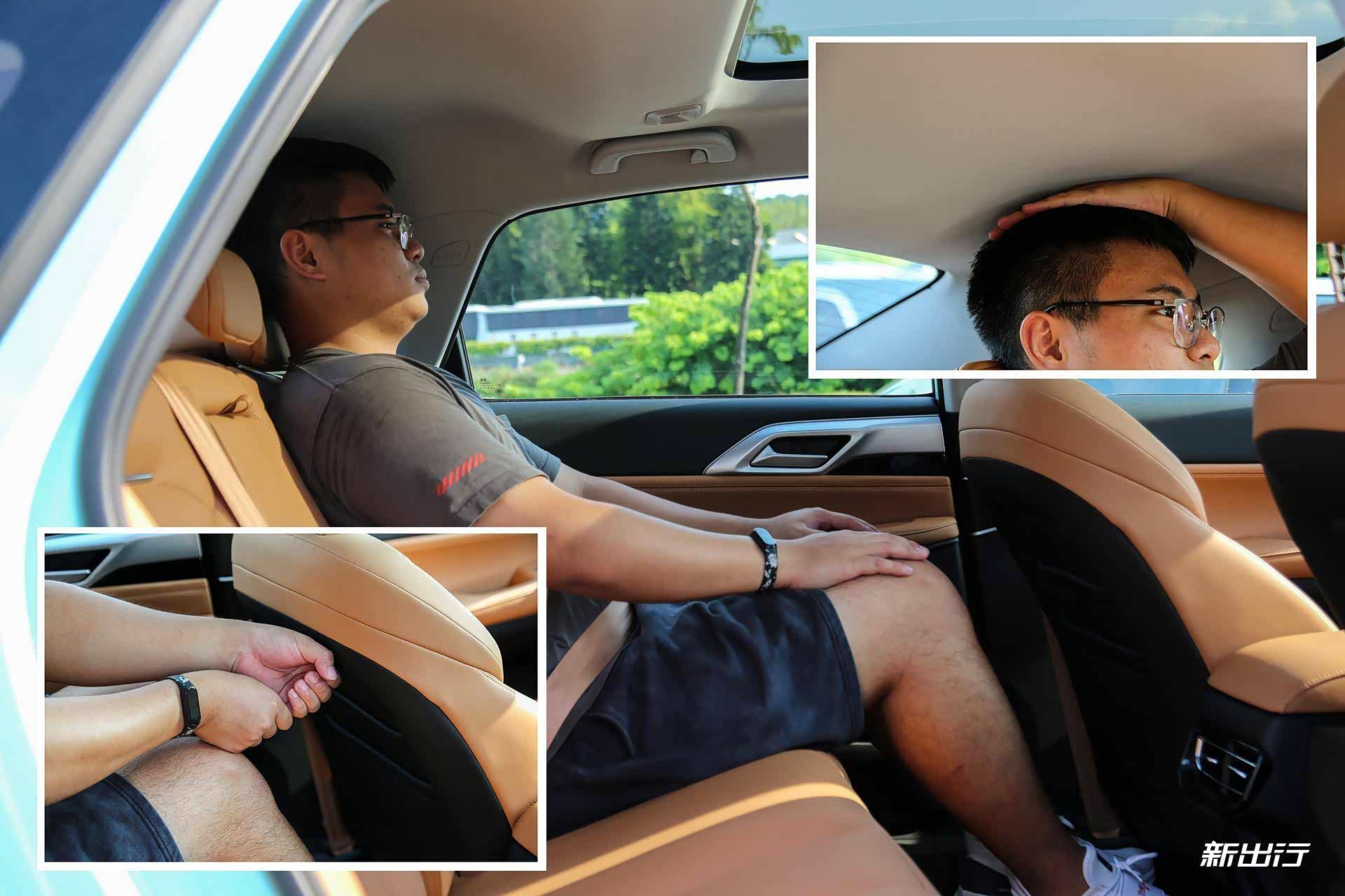 在乘坐空间方面,这是一个大的优势,1.8m的体验者坐在前排,此时前排头部还剩下一拳的距离(打开幕布后大约有一拳四指),此时保持前排不动的情况下来到后排,此时后排头部还有一指的距离,后排腿部还有大约两拳的距离。