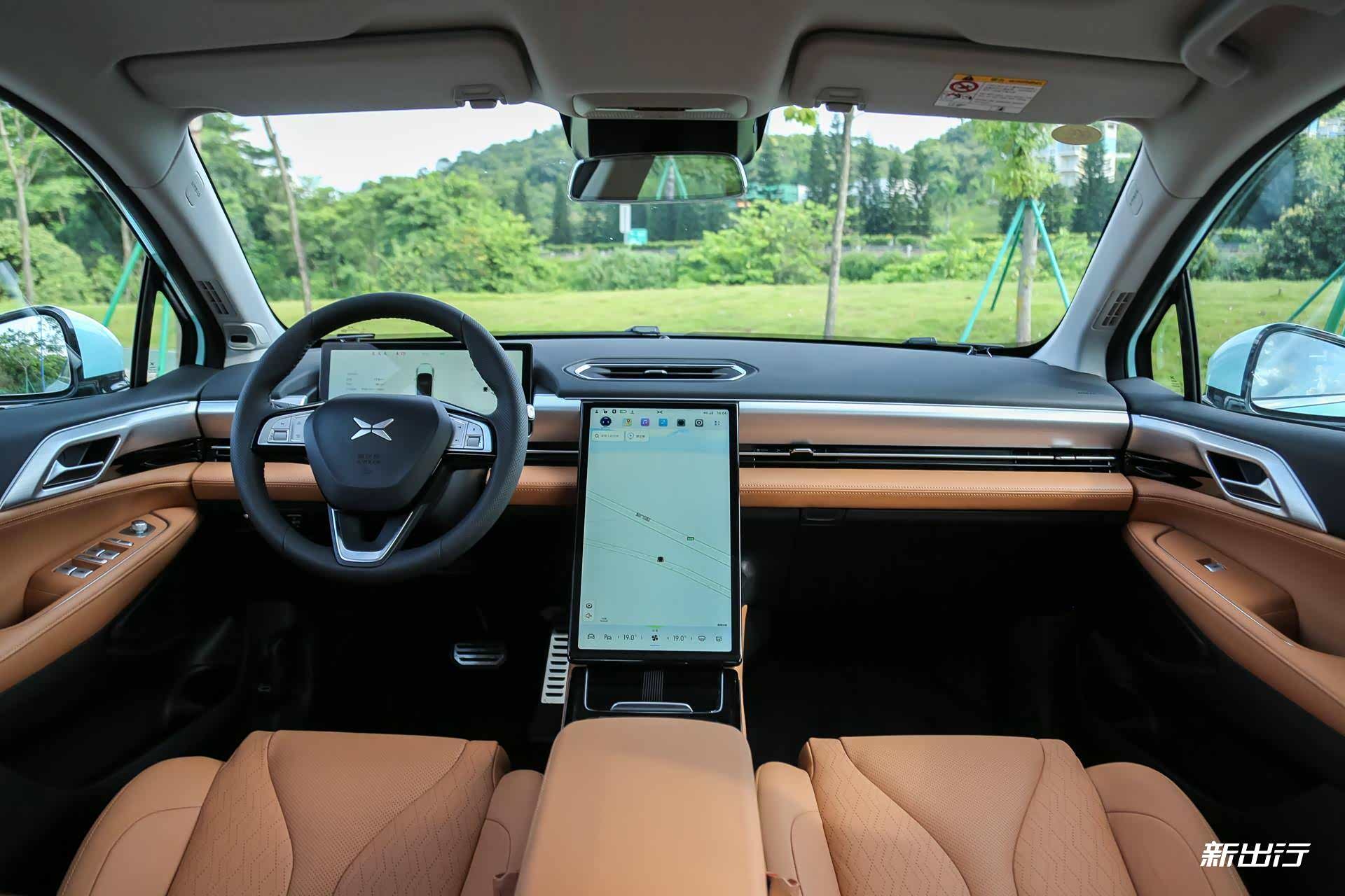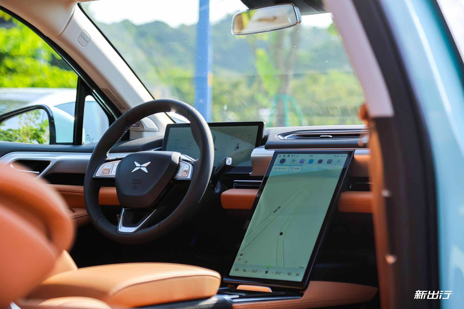 内饰上与 P7 最大的不同就是 P5 采用了竖屏的设计,P7 则为横屏。实际上大竖屏使用起来非常爽,和 R 汽车 MARVEL R 车内的竖屏倾斜角度很相似。