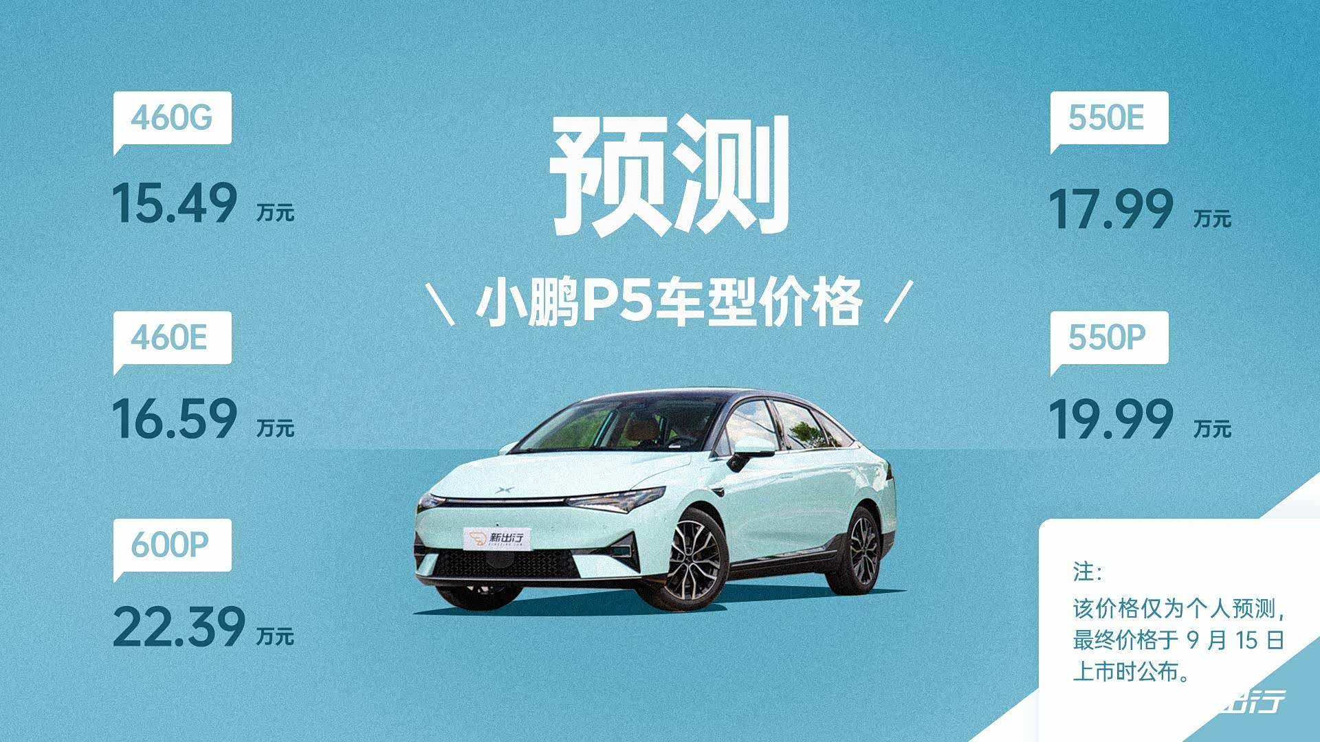 小鹏 P5 共推出 460G、460E、550G、550E、550P、600P 五款车型,目前仅公布了 16-23 万元的预售价区间,要到 9 月 15 日正式上市才会有最终价格。