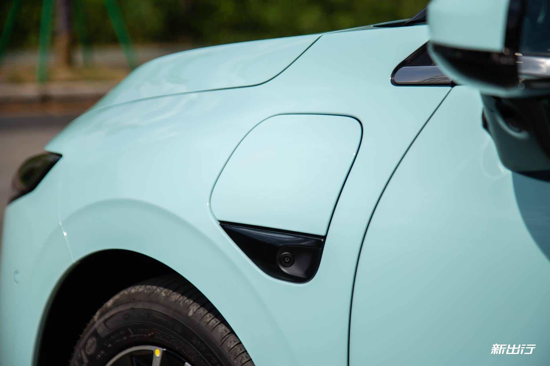 左前翼子板上的充电口为快充的形式,右侧则为慢充口,按压即可开启。