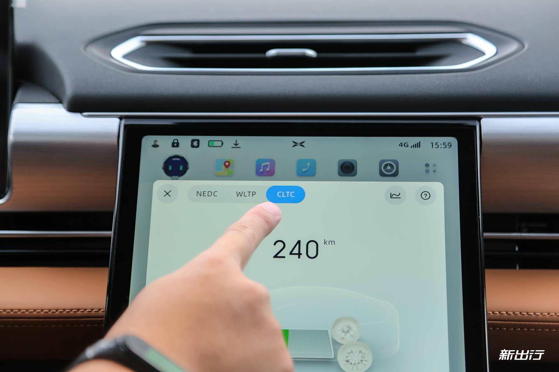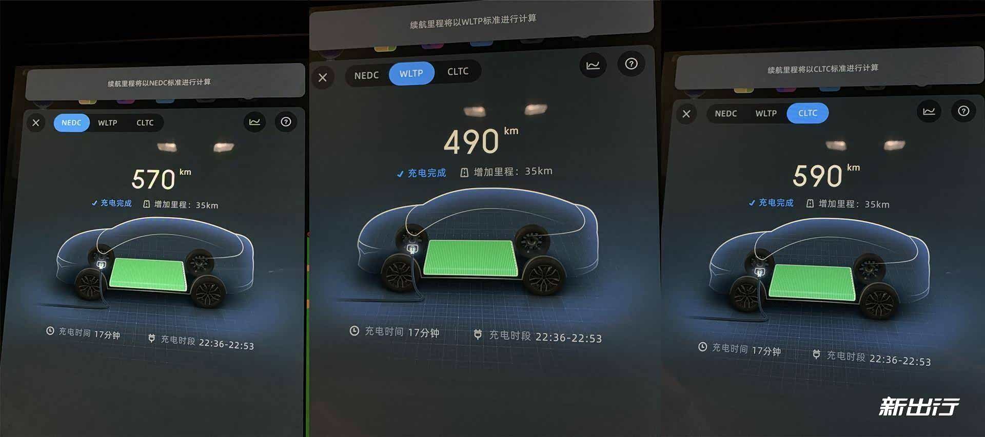 三种工况下的续航里程显示,从左至右顺序为 CLTC(570km)、WLTC(490km)、NEDC(590km)