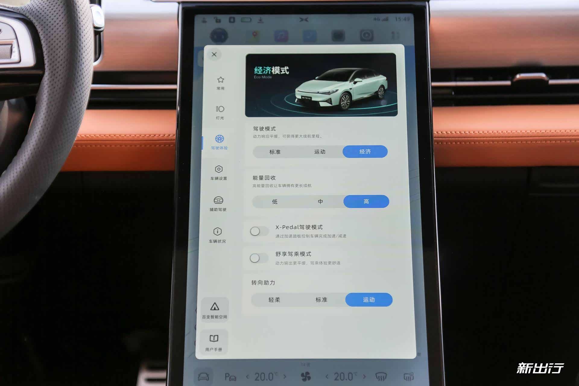 在小鹏 P5 上,共有轻柔、标准、运动三种方向盘力度调节的模式,其实我个人还是比较适应运动的模式,调节到最高后,P5 的转向力度会重一些。再配合上有点握感较为舒适的方向盘,会让你渐渐沉迷于驾驶之中。但调节到最低的档位后,转向手感就轻盈了,适合新手多一些。