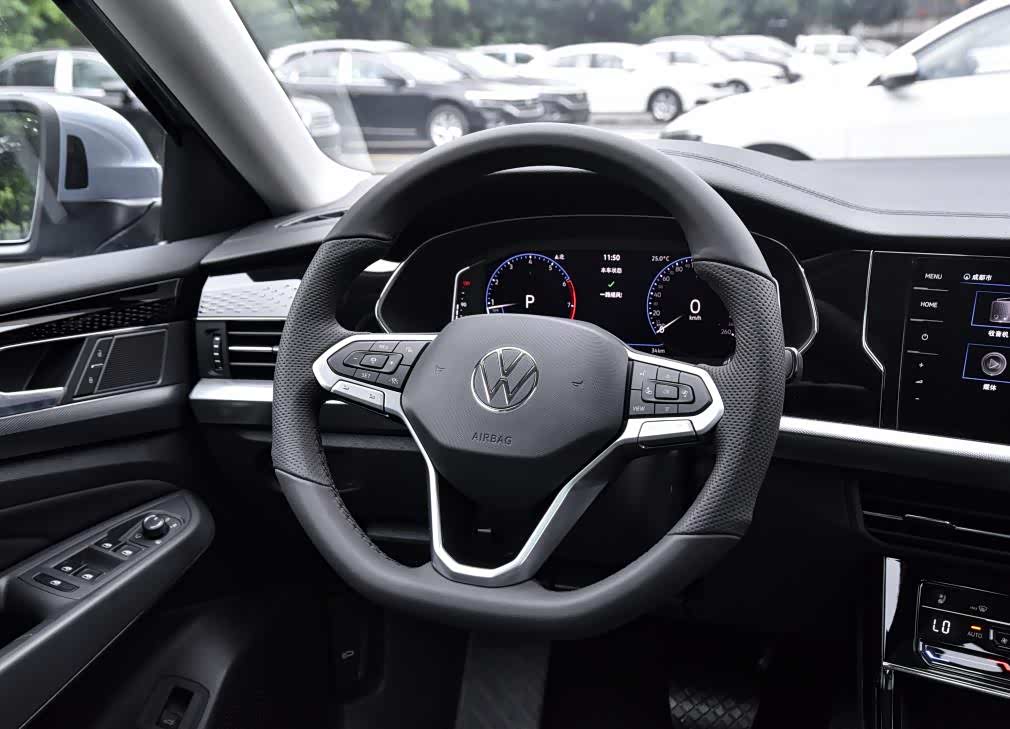 新款帕萨特的方向盘是真皮材质,有打孔的处理,握感也比之前更加舒适。配备10.2英寸的全液晶仪表盘,UI动画设计非常简单,基本的车辆信息显示,没有太多动画效果。