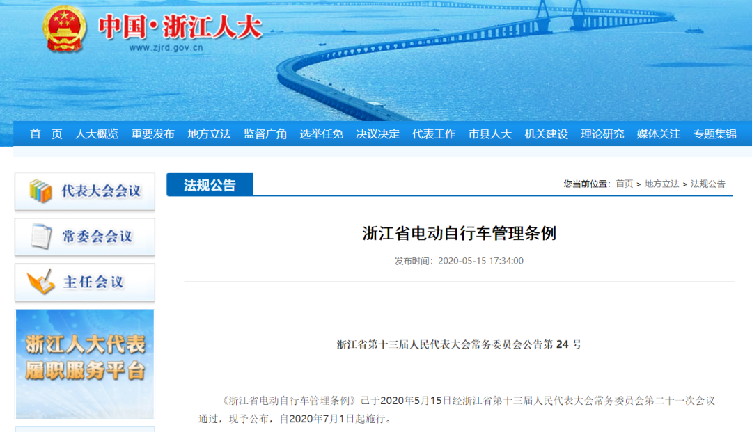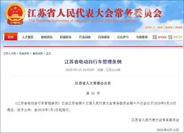 在2020年5月15日,江苏和浙江前后分别出台了《江苏省电动自行车管理条例》、《浙江省电动自行车管理条例》,并且在2020年7月1日正式实施。