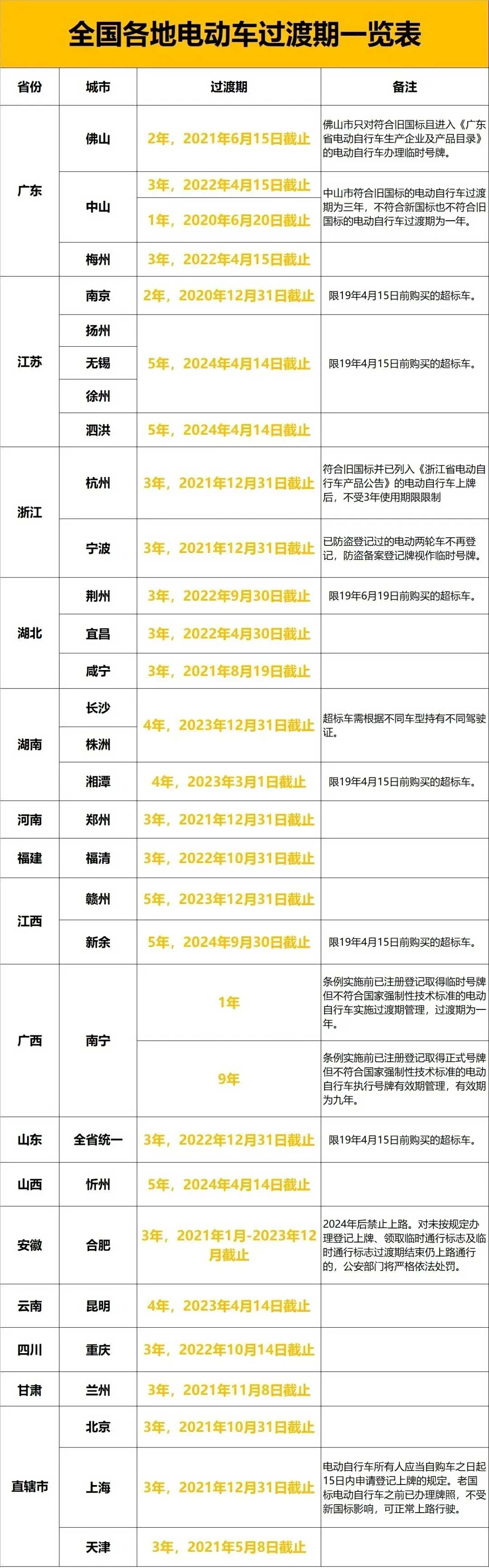 新国标的实行也就意味着非国标电动车的逐渐淘汰。而就目前来说,市面上绝大部分车辆都是非国标电动车。对于这种情况,国家也不会采取一刀切的政策,各个地方都采取了相应的过渡期来使老百姓有足够的时间处理。