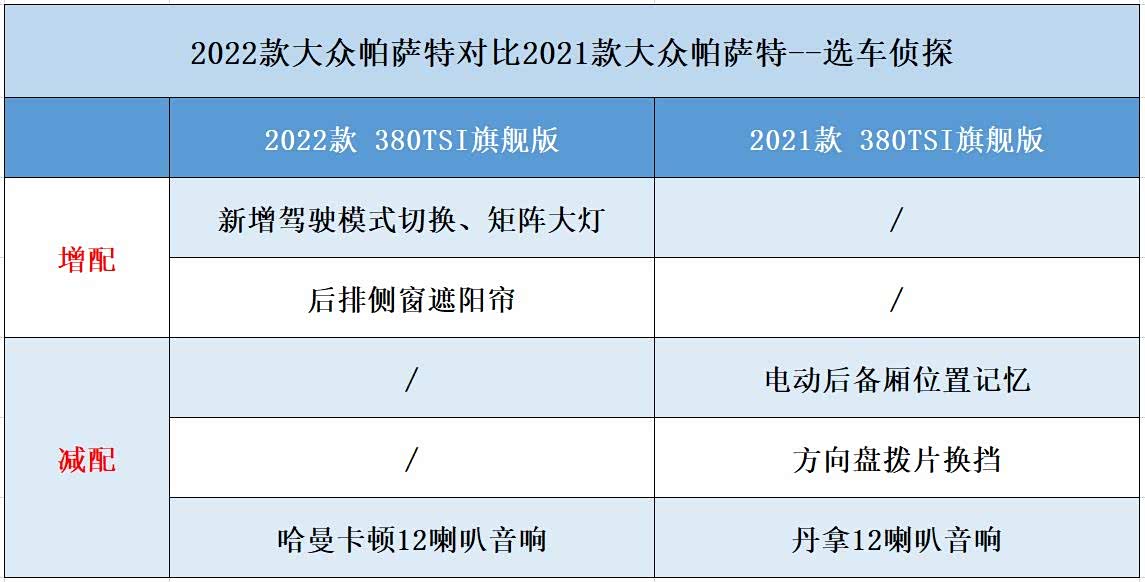 近日,2022款 上汽大众帕萨特正式上市,其中燃油版本共计10款车型,官方指导价为17.99-25.09万元。作为中期改款车型,2022款在外观设计和内饰上进行了修改,同时配置上有明显的调整,380TSI(2.0T)旗舰版价格下降3.2万,那么有没有减配的情况?下面我们来详细分析。