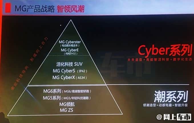 网上车市从上汽名爵了解到,名爵将会打造Cyber系列成为旗下电动子品牌,目前Cyber系列已经规划了4款新车,涵盖跑车和SUV,其中包括已经亮相的MG Cyberster概念车、MG CyberE(代号EH32)、MG CyberS(代号IP42)、MG CyberX(代号AS34)。