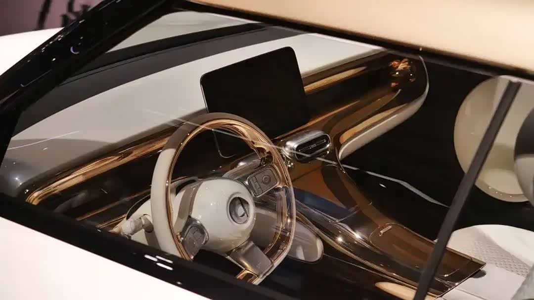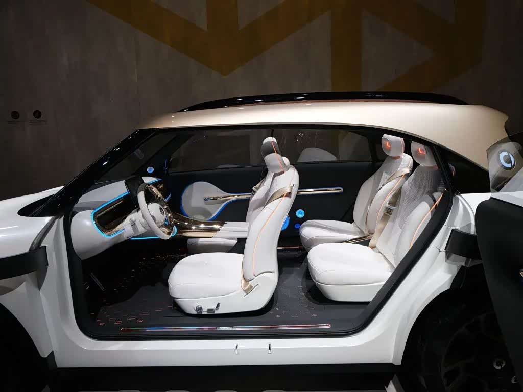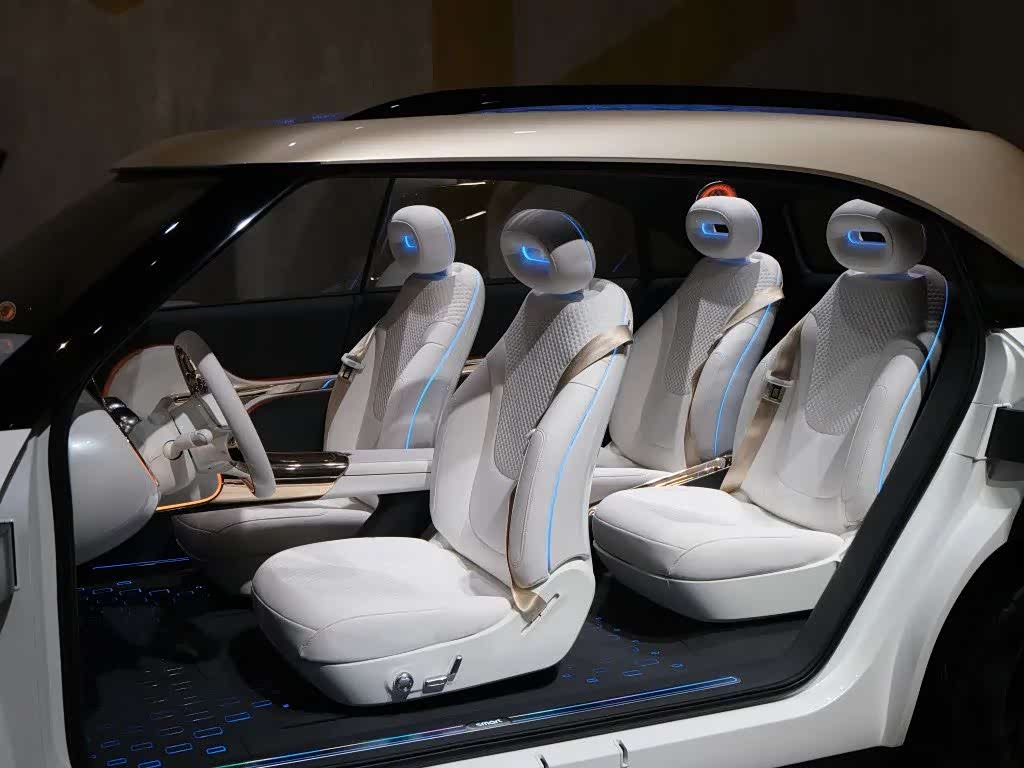作为流淌戴姆勒基因的品牌之一,内饰对豪华氛围的营造必不用疑虑。整个座舱几乎被金色和米色两种配色承包,而这种非黑色的搭配恰恰能把豪华氛围营造得更为透彻。整个中控台表面几乎被金色金属饰板包围,并与下方的中央通道连为一体,金灿灿、亮闪闪,很是晃眼;而运用大量“回”字形设计元素的空调出风口以及环中控一圈的车内氛围灯,则强化了这种视觉上的豪华气息。三幅式方向盘样式与目前奔驰的一些车型非常相似,而盘辐同样采用了金色镶嵌米色的搭配,不过量产之后可能有所调整。