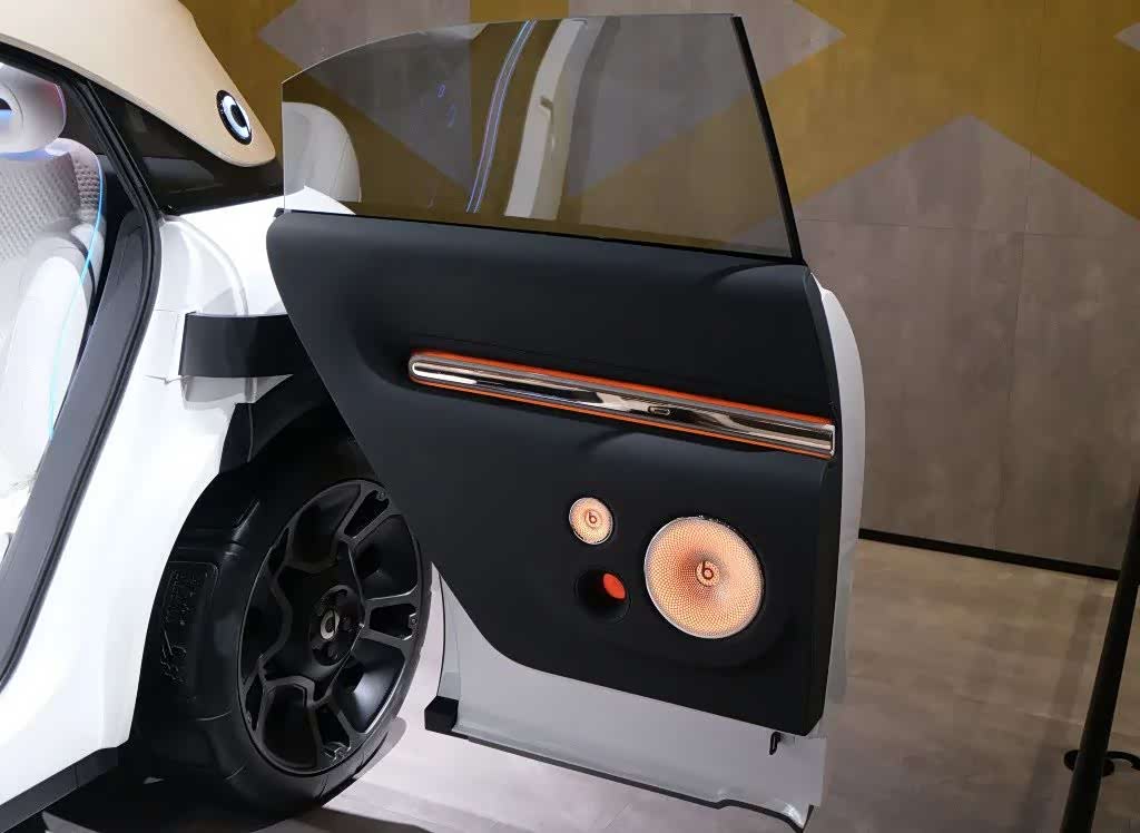 也许因为是概念车吧,它的后车门开合角度非常大,并且只采用了一个可伸缩式的合页,乡村土著表示它随时有“掰断”的可能。言归正传,这套车门的设计才是亮点,首先是无框车门,够靓够拉风,但更有意思的是它配备了Beats的音响,要知道,这个在移动耳机行业称霸一族的品牌,可很少成为汽车主机厂的供应商。