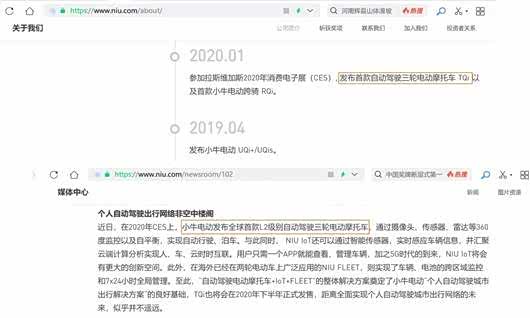 其次,这样的提法同样避不开“自动驾驶”和“驾驶辅助”的概念冲突。小牛CEO李彦曾表示不排除会做自动驾驶,小牛官网大事记也明确记录为“自动驾驶”,然而同样是小牛官网,通稿里却是这样描述:“小牛电动发布全球首款L2级别自动驾驶三轮电动摩托车,通过摄像头、传感器、雷达等360度监控以及自平衡,实现自动行驶、泊车。与此同时,NIU IoT还可以通过智能传感器,实时感应车辆信息,并汇聚云端计算分析实现人、车、云时时互联。”