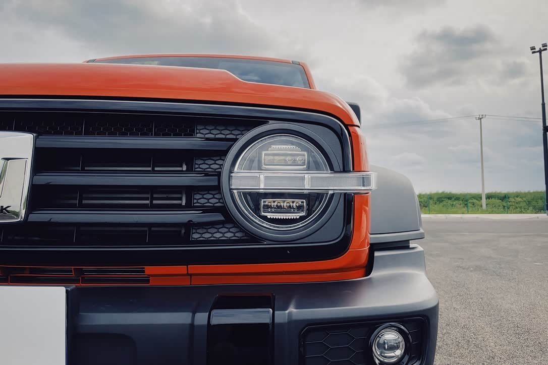 外观方面,坦克300的外观堪称斩男神器,硬汉风复古造型使其非常具有吸引力。整体前脸线条平直,四方四正的中网格栅搭配上圆形前车灯增加了不少复古韵味,车灯中还融合了一字型日行灯,设计感十足。前保险杠采用了突出设计,搭配上拖车钩,越野气息浓郁。