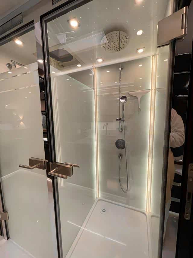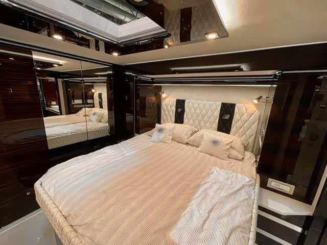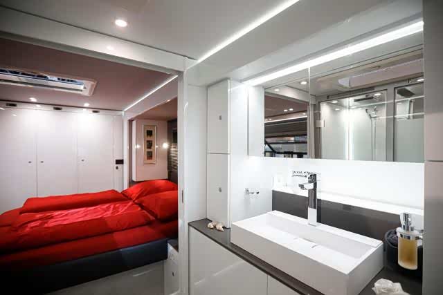 房车的内部带来的视觉冲击毫不亚于车底下的布加迪 Chiron,上好的瓷砖以及皮革使用奶白色的色调搭配,赋予房车一种奢华和时尚的感觉。来自柏林之声的音响系统据说高达 30 万欧元(约合人民币 229 万元),且日常设施一应俱全,包括磁炉、微波炉、烤箱和咖啡机,甚至还有一个酒柜。