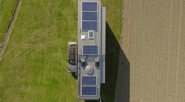 车顶有装有一系列太阳能电池板,2 千瓦太阳能电池版和一台 8 千瓦发电机可为车内的日常供电进行储能。