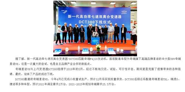 从柳州北部生态新区管委会的官网上,我们也可以明确看到,DCT380是柳州上汽汽车变速器有限公司自主设计开发并全新投产的新一代双离合自动变速器,铁铮铮属上汽自主研发,卖给奇瑞使用。