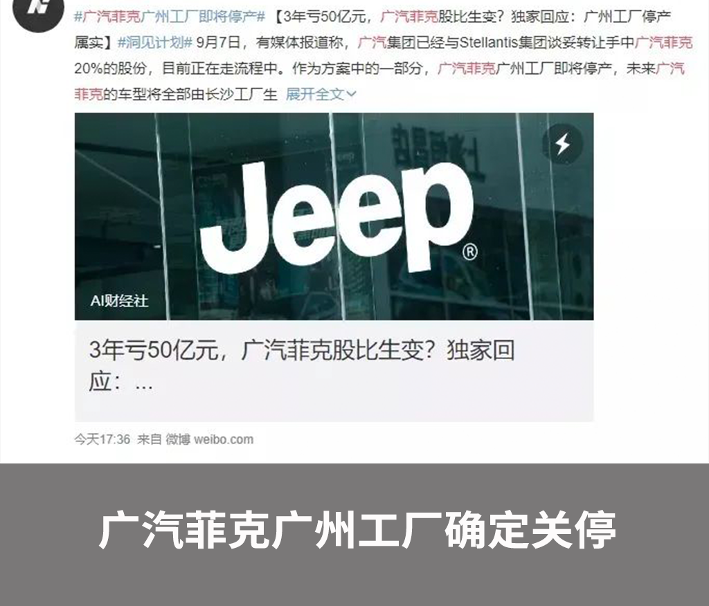 9月8日,Stellantis集团发布声明称,经过Stellantis集团与广汽集团双方股东的讨论,广汽菲克合资公司将专注于其在长沙工厂的生产,以提升该工厂的产能利用率,进一步降低企业运维成本、提升合资公司管理效率,有效增强企业的综合竞争力与盈利能力。股东双方将对相关工作的稳步、有序推进,特别是员工的妥善安置,提供充分支持。此声明也意味着广汽菲克位于广东广州的工厂将被关停。