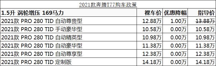 近日,从长沙经销商处获悉长沙地区有 奔腾T77 销售,颜色可选,多重购车方案为您精心定制!进店试驾即赠送夏日清凉礼品。幸运礼:到店购车客户即可100%获得超值购车礼,还有机会抽取各种家电及奔腾精品,100%中奖金融礼:0息、0首付,超长5年贷。置换礼:二手车置换享高达万元补贴。转介礼:老客户介绍新客户到店看车均可获得精美礼品一份,成交给予现金奖励500元。大客户尊享礼:大客户企业员工购车高达5000元补贴,感兴趣的朋友可以到店咨询购买,详情见下表: