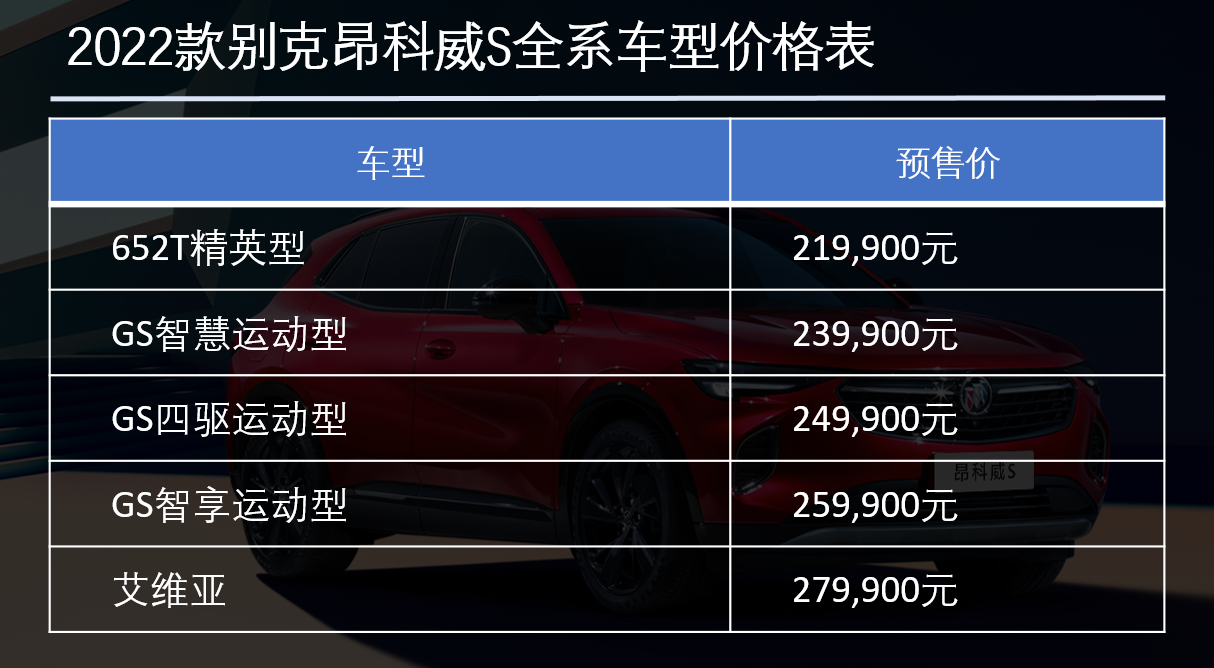 9月15日,2022款 别克昂科威S正式上市, 5款车型售价21.99-27.99万。值得关注的是,作为中期改款车型,2022款别克昂科威S新增了GS版车型,但仅在外观上增加了GS专属运动套件,通过专属幻影蓝涂装以及酷黑运动外后视镜、20英寸高亮黑铝合金轮毂、红色刹车卡钳等设计,进一步提升了运动感,在动力方面则没有太大的变化。不过车型阵容的调整也让2022款别克昂科威S在配置层面上有了很大的提升,那么2022款别克昂科威S那款车型最值得选择呢?