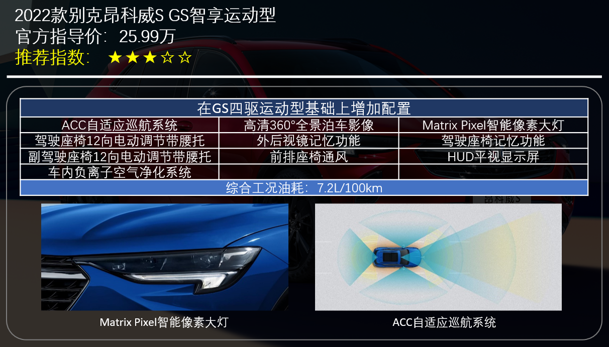 相比于2022款别克昂科威S GS四驱运动型,2022款别克昂科威S GS智享运动型在配置上增加了很多,诸如ACC自适应巡航、全景影像、智能像素大灯以及主副驾驶席12向电动调节以及前排座椅通风、HUD等科技感十足的功能,这些配置相对于同样是两驱的2022款别克昂科威S GS智慧运动型,差价在2万元,对于一些用户来说可能没有加1万来套四驱系统更香,但如果你更需要这些配置而不是四驱系统,这款车型还是非常合适的。