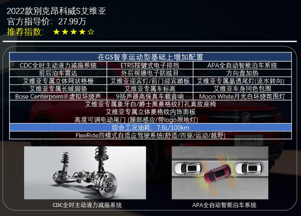 作为顶配车型,2022款昂科威S艾维亚可以说是昂科威S的完全体,价格上比次顶配的GS智享运动版增加了2万元,配备四驱系统,并且装备了CDC全时主动液力减振系统,并且在配置上和2022款别克昂科威S GS智享运动型看齐,还增加了方向盘加热以及全自动智能泊车系统,豪华感和科技感上都达到了巅峰,这款车型更推荐那些预算充裕,对配置有一定要求的用户。
