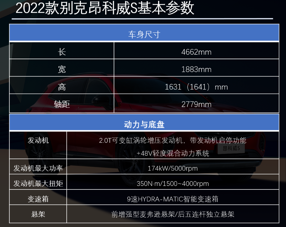 在动力上,2022款别克昂科威S全系搭载2.0T可变缸涡轮增压发动机,匹配9速HYDRA-MATIC智能变速箱以及48V轻混动系统,最大功率174kW,最大扭矩350Nm,百公里加速最快为7.7s。
