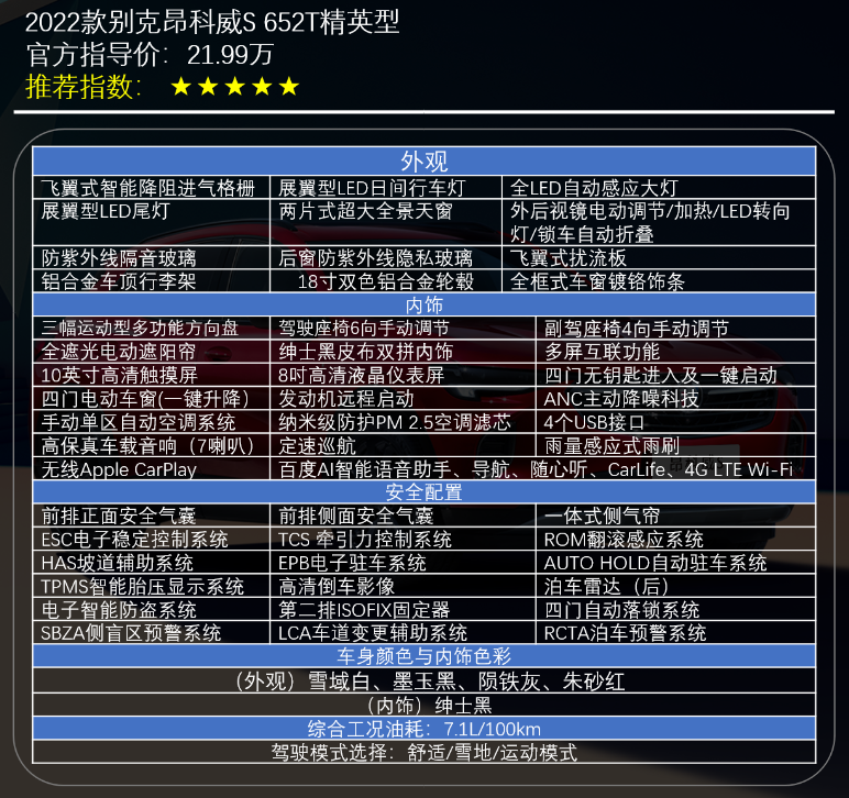 在配置层面上,作为入门版车型,2022款别克昂科威S 652T精英型在配置上已经非常的全面了,尤其是8英寸液晶仪表以及10英寸中控大屏的配置和顶配车型没有什么差别,而且其搭载的别克eConnect智能互联系统,具备百度AI语音控制、在线导航、随心听、无线Apple CarPlay智能手机映射、CarLife等功能,再加上车道变更辅助、盲区监测以及倒车影像等,整体配置水准在同价位车型中可以说是非常具有竞争力的,这款车型也是我们首要推荐的车型。