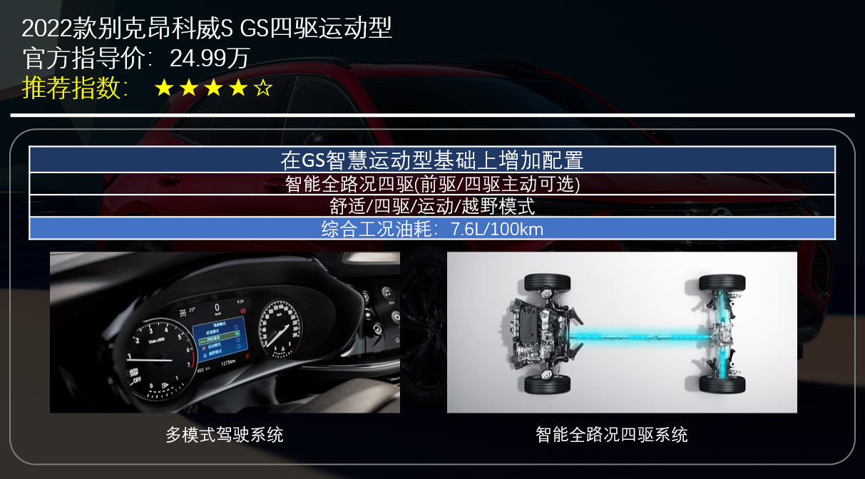 与2022款别克昂科威S GS智慧运动型相比,2022款别克昂科威S GS四驱运动型在配置上没有太大的变化,只是增加了一套四驱系统,并且在驾驶模式选择上,多了四驱和越野模式,百公里综合油耗则提升到了7.6L。由于没有增加什么配置,仅仅多了一套四驱系统,1万元的差价也不算太离谱,但是考虑到大部分用户其实对四驱系统的需求并不是很高,这款车型我们不做特别推荐。