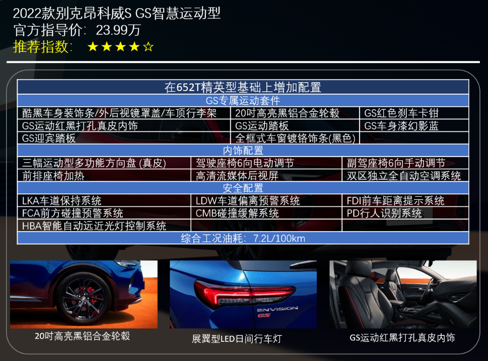 作为2022款别克昂科威S GS的入门版车型,2022款别克昂科威S GS智慧运动型在在价格上相比625T精英型高了2万元,但是多出了GS专属运动套件以及驾驶席电动调节、前排座椅加热、双温区自动空调、流媒体内后视镜以及车道保持、车道偏离预警、前方碰撞预警以及智能自动 远近光灯控制等 功能,在安全层面上进一步的提升,舒适性上也有所保证,是我们次要推荐的车型。
