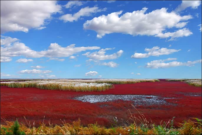2. 红海滩的碱蓬草每年4月长出地面,初为嫩红,渐次转深,10月由红变紫。需要特别注意一下游览季节。