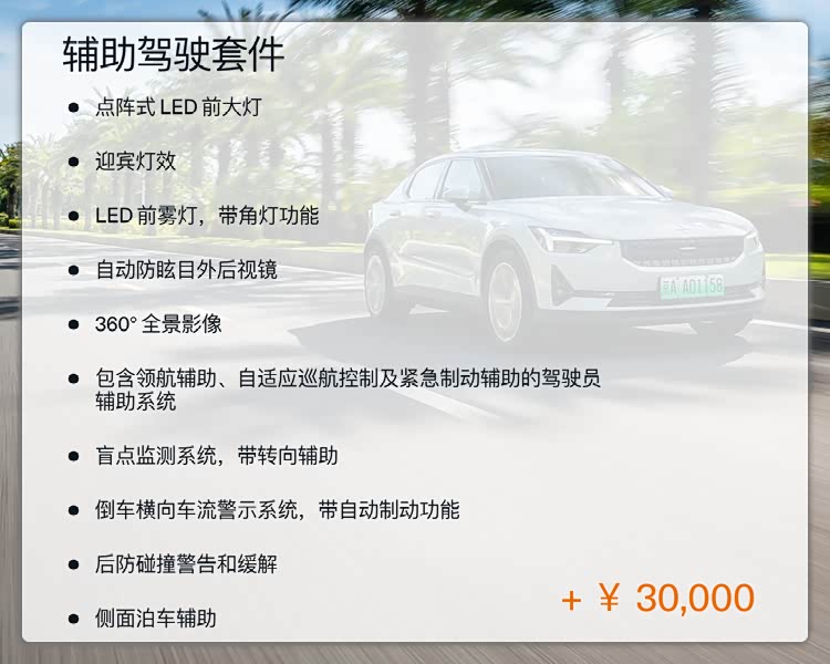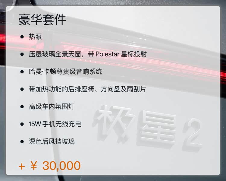极星2全新系列也带来了新的升级选装包。其中辅助驾驶套件包含自适应巡航控制及紧急制动辅助的驾驶员辅助系统、侧面泊车辅助、点阵式 LED 前大灯、360°全景影像等重点配置,价格为3万元;而豪华套件则包含哈曼·卡顿尊贵级音响系统、带 Polestar 星标投射的压层玻璃全景天窗、后排座椅加热、热泵系统、手机无线充电等配置,价格同样为3万元。Nappa内饰组件则包含大麦色Nappa真皮内饰、座椅通风功能、重构横切纹木纹饰件等,价格为5万元。