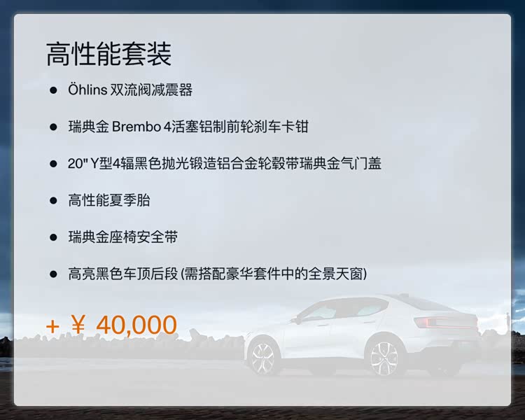 还有一个让极星2“颜值翻倍、功力大增”的老朋友——高性能套件,价格由原来的4.2万元调整为4万元。增项依然包括Öhlins双流阀减震器、瑞典金色 Brembo 4活塞铝制前轮刹车卡钳、带瑞典金色气门盖的20英寸Y型4辐黑色抛光锻造铝合金轮毂、德国马牌高性能夏季胎,以及瑞典金色座椅安全带等硬核配置。高性能套件仅针对双电机版车型选配。