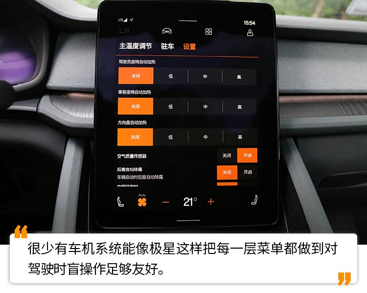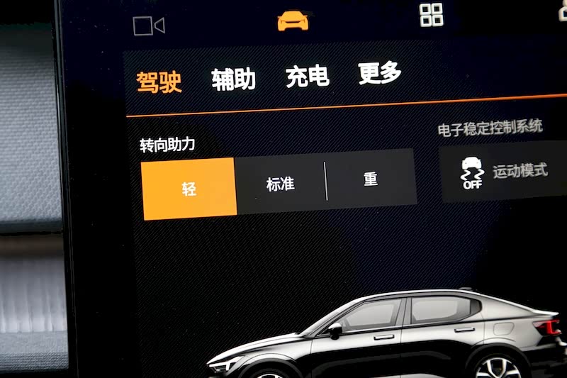 新款极星2并没有新增可供驾驶者调节的多模式驾驶模式,和原来一样运动模式基本上就等同于ESP的开关。方向盘转向力度可以进行三级调节,最轻的转向力度对女士来说应该也很轻松,更高两级的反馈感也适中,区别不大。