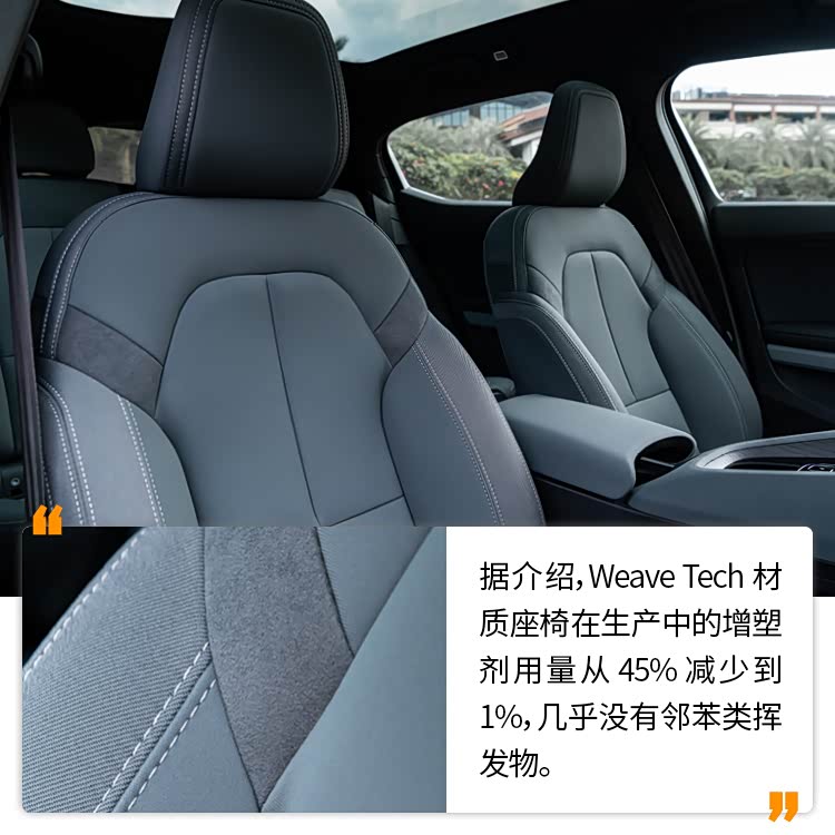 秉持“纯素内饰”的理念,极星设计师从专业潜水服材质中获取灵感,打造出Weave Tech高科技座椅材质。乘坐舒适度,经久耐用、防水防尘、易于清洗,同时为整车减重7.5公斤,实现轻量化需求。