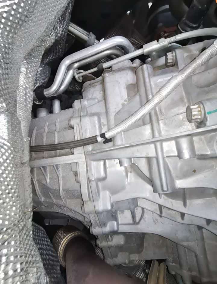 再看变速箱也是很干爽的,无渗油漏油,而且发动机变速箱结合处螺丝也无拆卸痕迹。发动机舱的状态还是不错的。