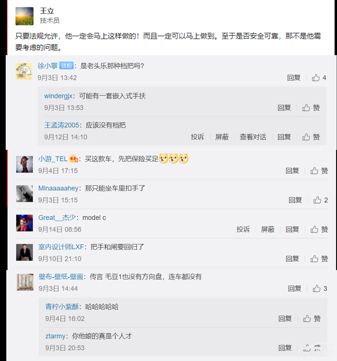 有网友表示,“只要法规允许,他(马斯克)一定会马上这样做的!而且一定可以马上做到。至于是否安全可靠,那不是他需要考虑的问题。”还有网友质疑,没有方向盘,难道装配的是“老头乐”那种挡把吗?