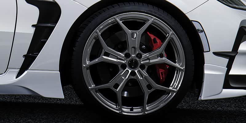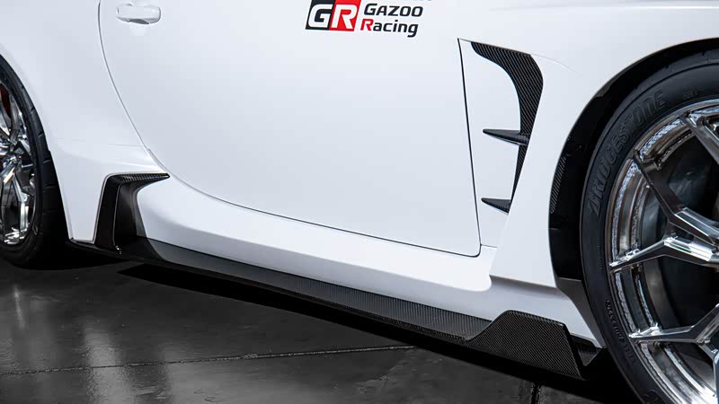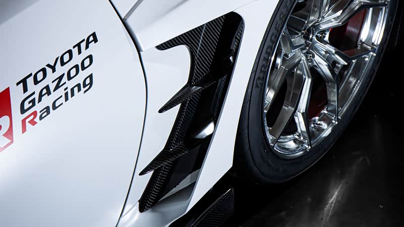 此外,由于前后翼子板内部带有导流通道,本身就像宽体一样往外扩张,因此,为了配合宽体设计,GR Parts Concept的前后轮分别向两侧再拉宽了43mm,等同于轮距一共增加86mm,并且搭配上刚性更好的19寸Y型五辐式锻造轮圈,轮胎、刹车系统等也跟着升级为GR改装套件。