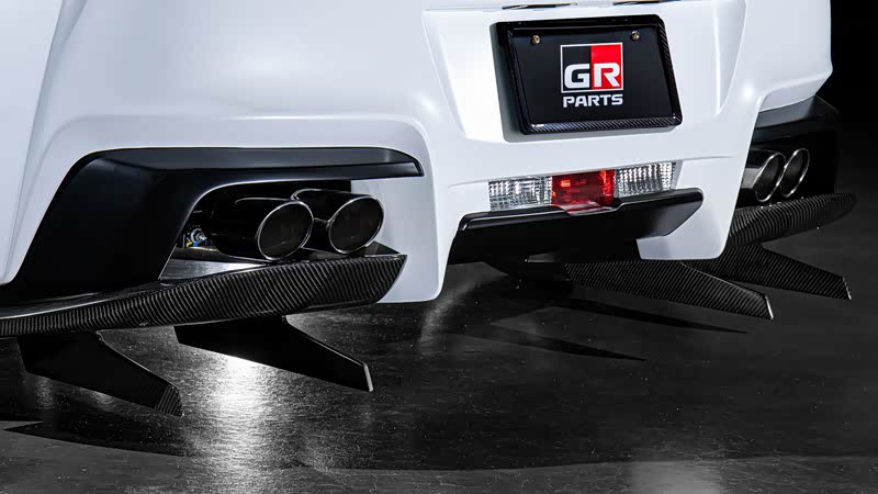 在外观方面,GR Parts Concept无论是前后包围、前后翼子板、引擎盖等都已经换上了量身打造的空气动力学套件,除了可提高视觉张力外,精心设计的前下扰流板以及车身周围的导流孔,在高速行驶时将能产生更大的下压力来稳定车身,车尾部分还安装了模仿飞机主翼的大型碳纤维尾翼,同样能有效提供下压力,而整合于后下扩散器两侧的四出排气管布局,则能有效提高排气效率、发出震撼的声浪。