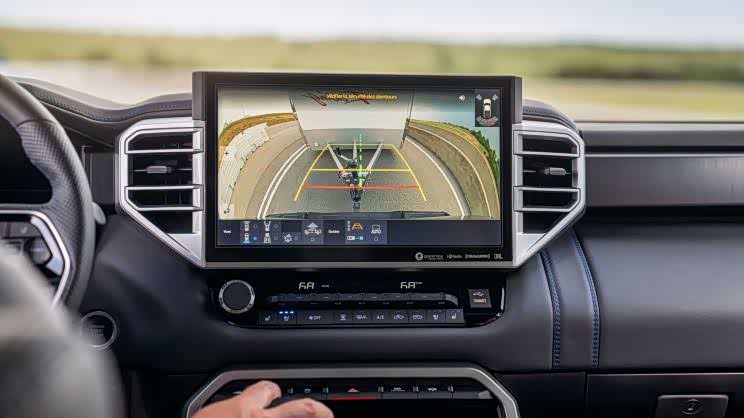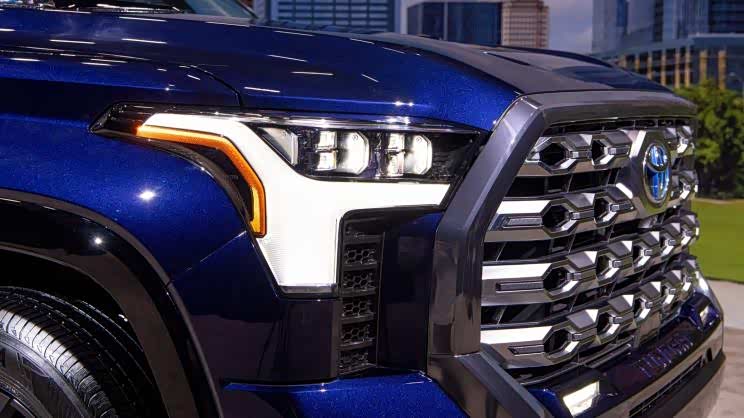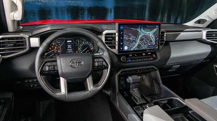 外观部分的提升相当明显,首先坦途依旧有普通版和TRD版和TRD Pro版,三种车型的外观方面也有差异,车头部分,更大面积的格栅看起来比老款车型更加霸气一些,同时中网纵向到底的设计也拉伸了车头的视觉高度,普通版车型的中网采用了镀铬装饰,而剩余两个相对更加运动的版本都是大尺寸的黑色中网,并且内部采用了TOYOTA的英文标识。