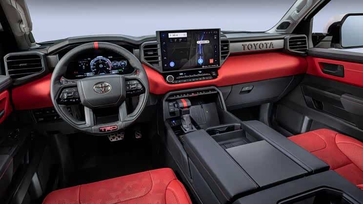 TRD版本则是采用了更加激进的红色内饰,配备TRD Pro座椅刺绣,并且副驾驶前方饰板还带有TOYOTA字样,与车头标识相呼应。