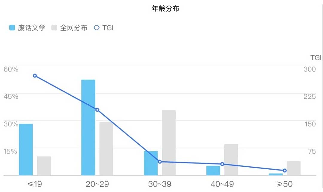 从百度指数显示的人群画像来看,在关注废话文学的人群中,30岁以下的人群比例占比超70%,其中20-29岁的个体占多数,也即是在校大学生和毕业不久的年轻人。