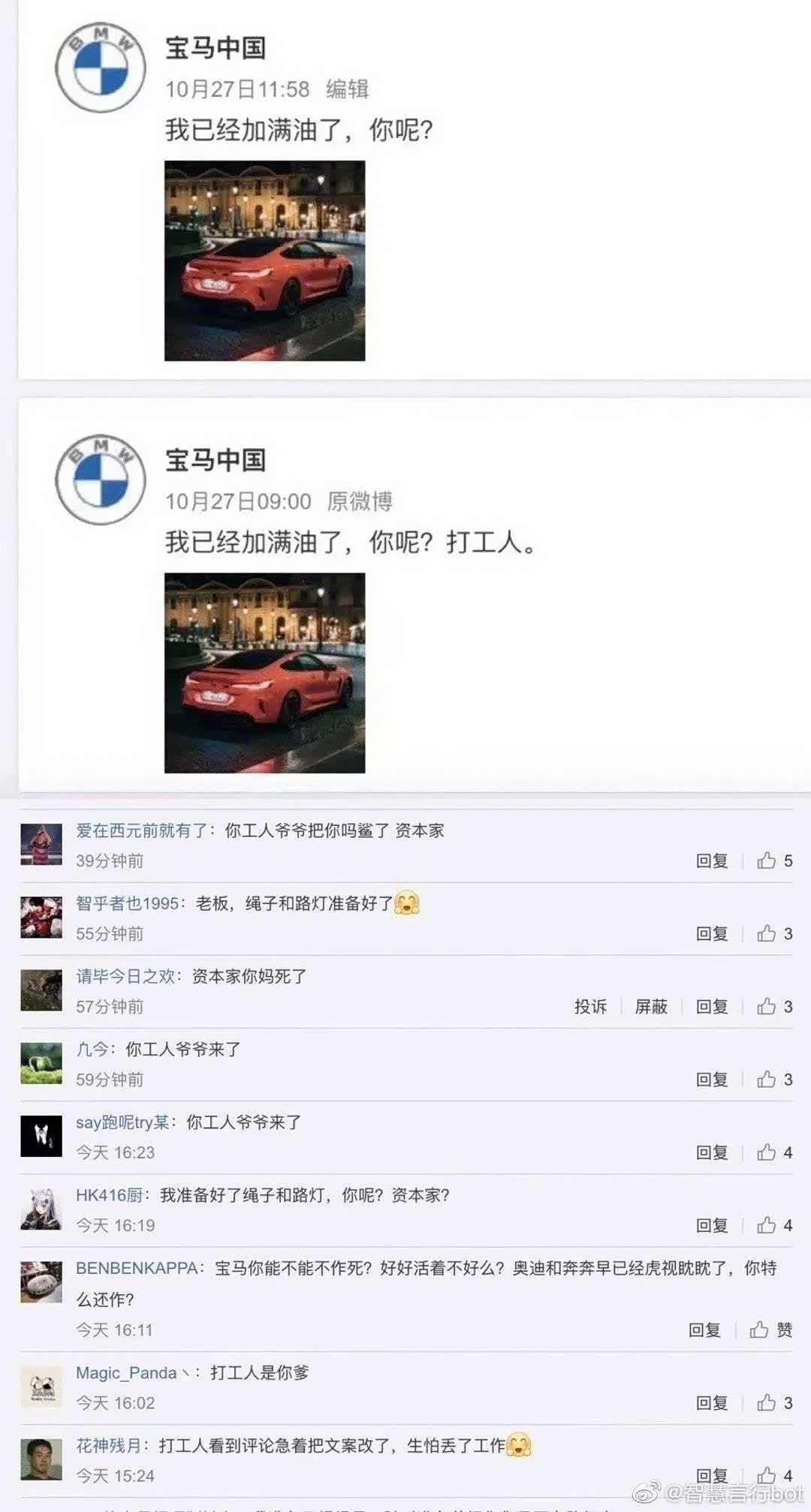 在去年“打工人”这个梗特别火的时候,宝马也借势营销,发了一条“我加满油了,你呢?打工人”,本以为能收获一大波热度,但不料激起了许多网友的负面情绪,“剥削”、“资本”等成了评论高频词,鉴于压力,官方不得不修改了这条微博。