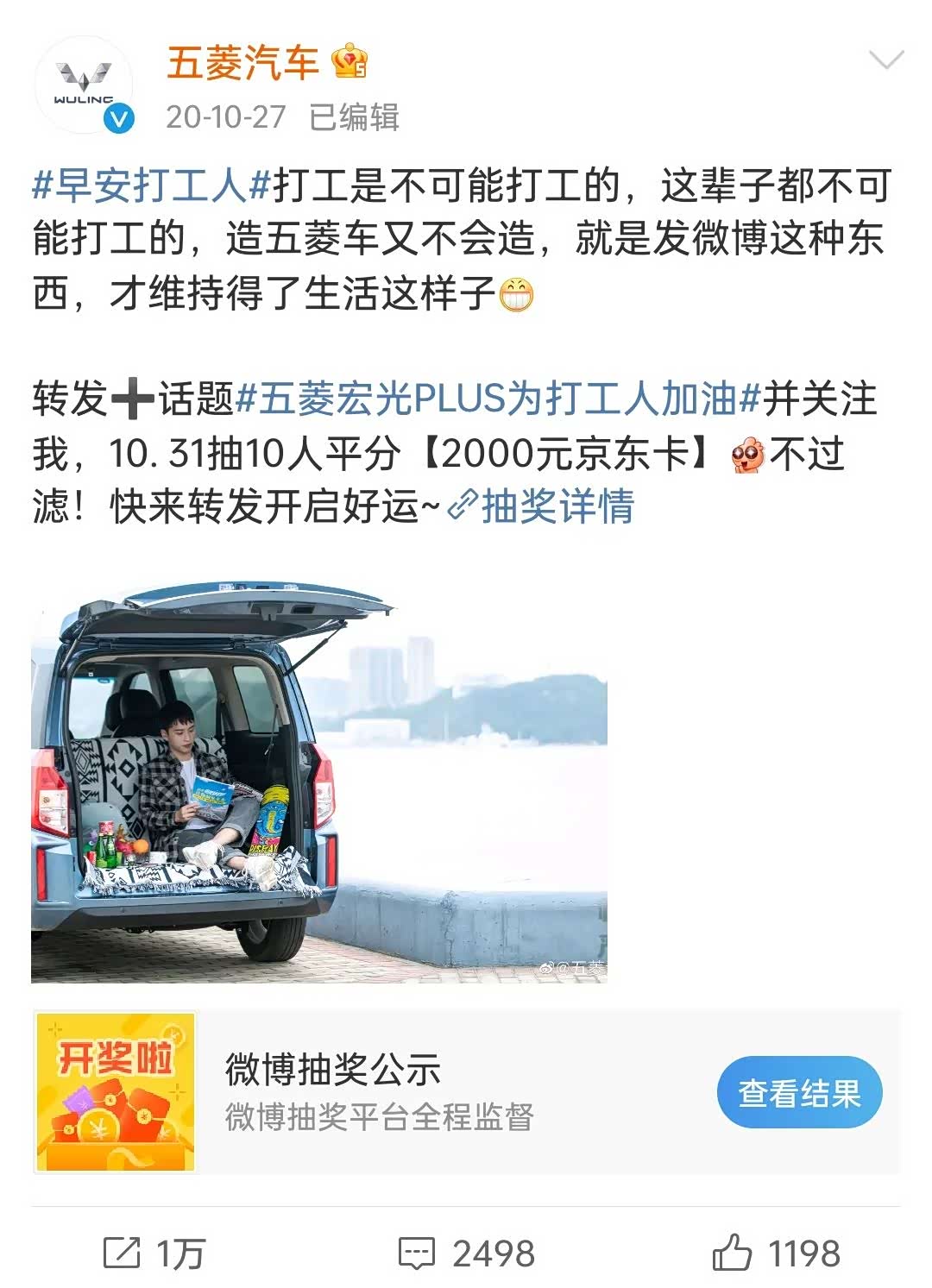 反观五菱汽车平价亲民的品牌形象,自嘲“打工人”也就不会让人出戏,既将梗与品牌调性链接,成功蹭上热度,又真正实现了拉近品牌与消费者的距离。