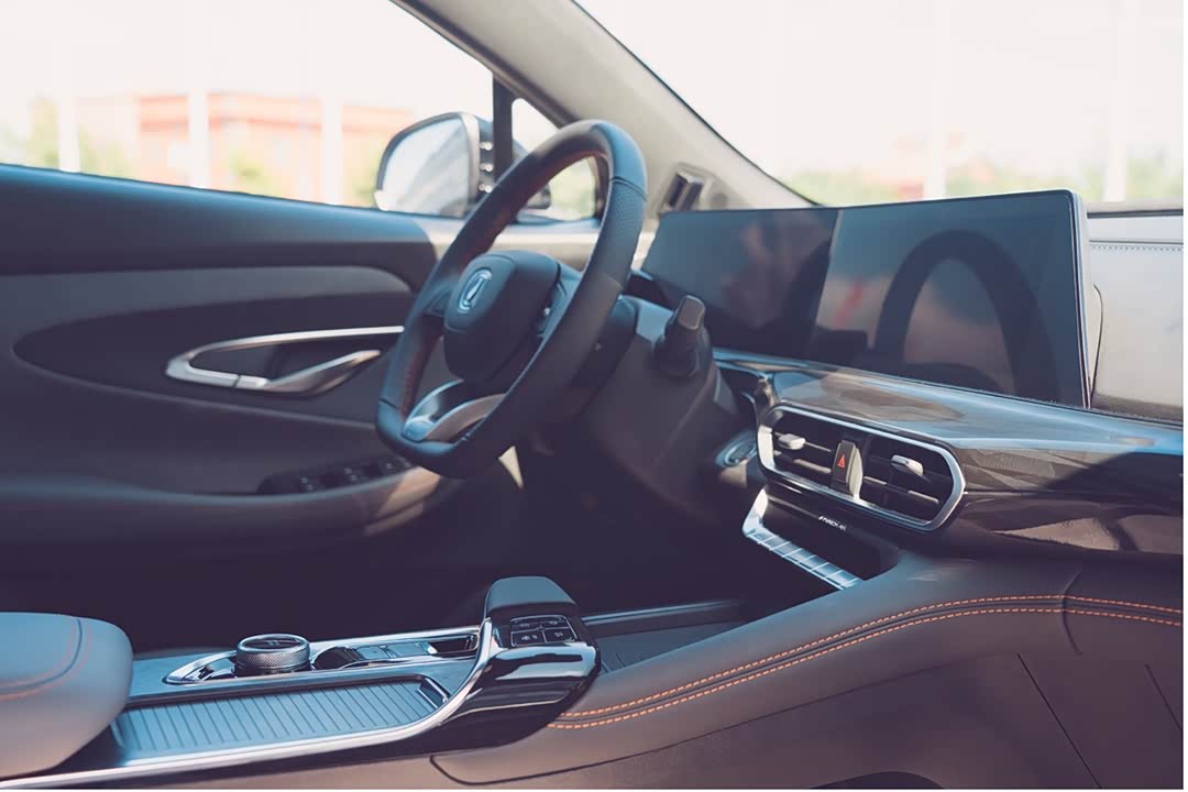 开启车门可以看到,传统的T字型布局中控台,装备了时下流行的悬浮式双联屏,以及造型奇特电子挡杆,传统设计与现代科技在长安UNI-T车型上得到了融合。车内触手可及的地方,采用皮质或软性材质包裹,配合细节处的打孔图案、拉丝面板和橙色缝线,车内氛围与外观的时尚感互相呼应。