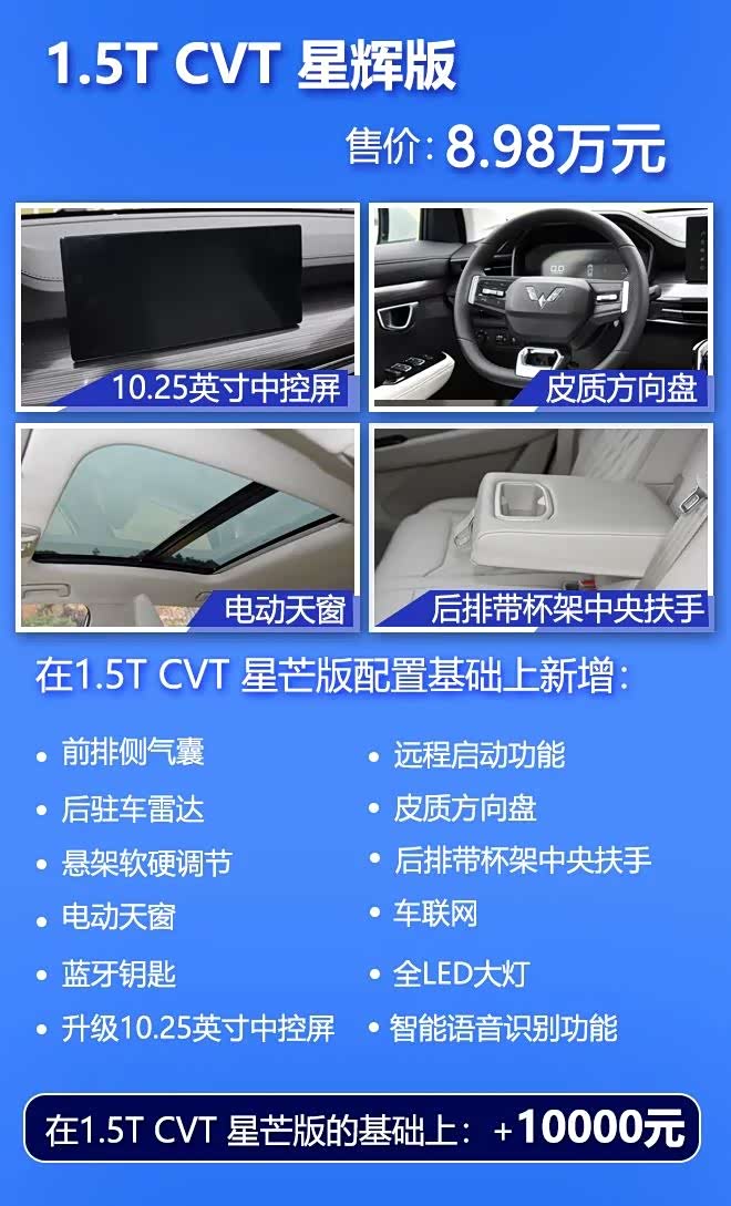 通过全系配置对比,我们首要推荐8.98万元的1.5T CVT 星辉版车型,与低一档的星芒版相比,虽然价格上多出1万元,但配置上却多出了前排侧气囊、电动天窗、蓝牙钥匙、远程启动功能、皮质方向盘、皮质座椅、后排带杯架的中央扶手、中控屏内置GPS导航、智能语音识别系统、车联网、后备箱12V电源、全LED大灯、自动头灯、主副驾车内化妆镜、雨量感应式雨刷等,结合性价比和多出的功能实用性两方面考量,星辉版配置的可购性最为突出。