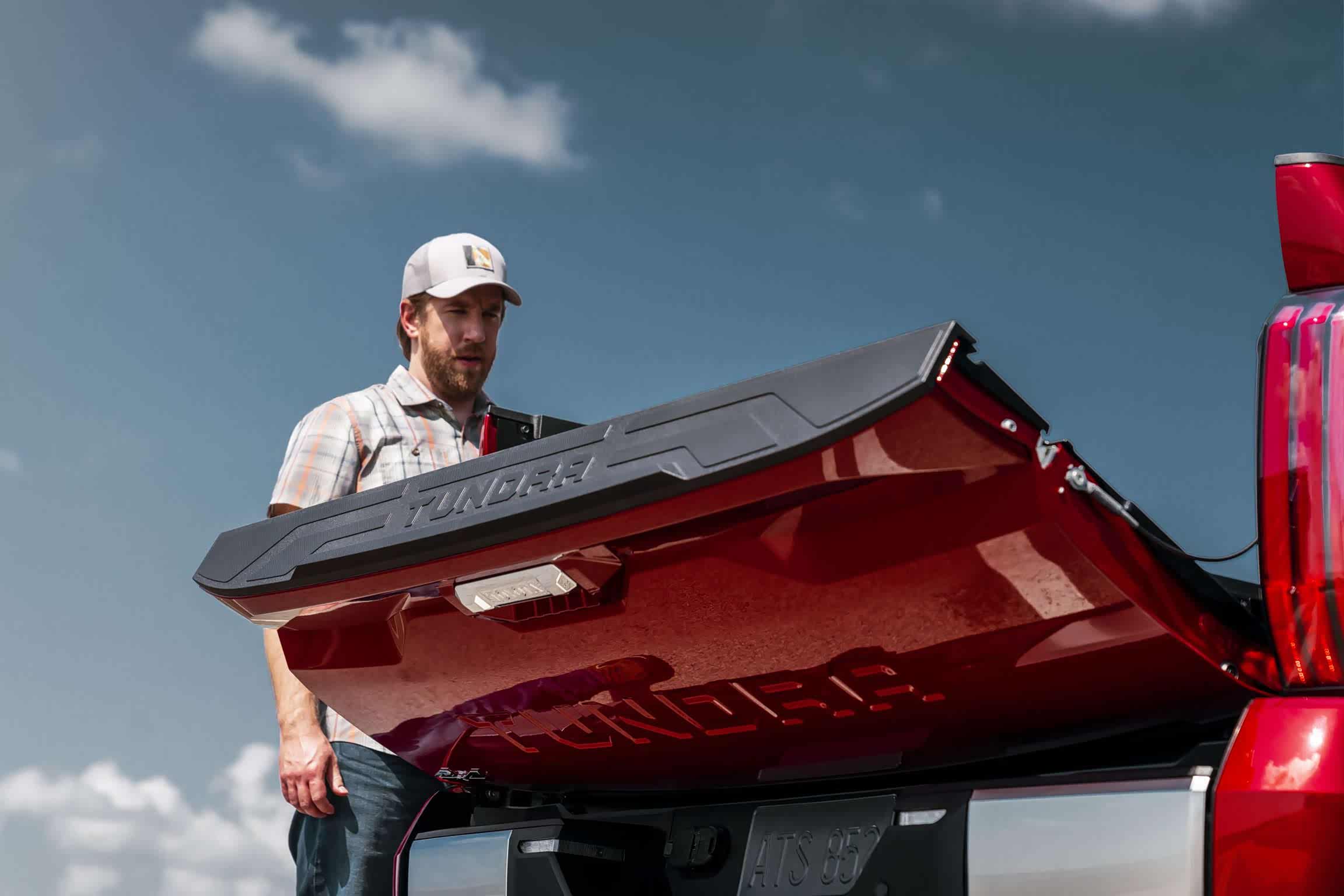 值得注意的是,全新Tundra在中网格栅上方拥有与F-150 Raptor相同的三個橘色小灯、轮拱处也配有两个橘色小灯,相信这是为了应对美国法规而设定(车辆宽度超过2032mm,需要安装小灯来表明车辆的宽度),因此这也表示Tubdra将会比现款的2190mm更宽。
