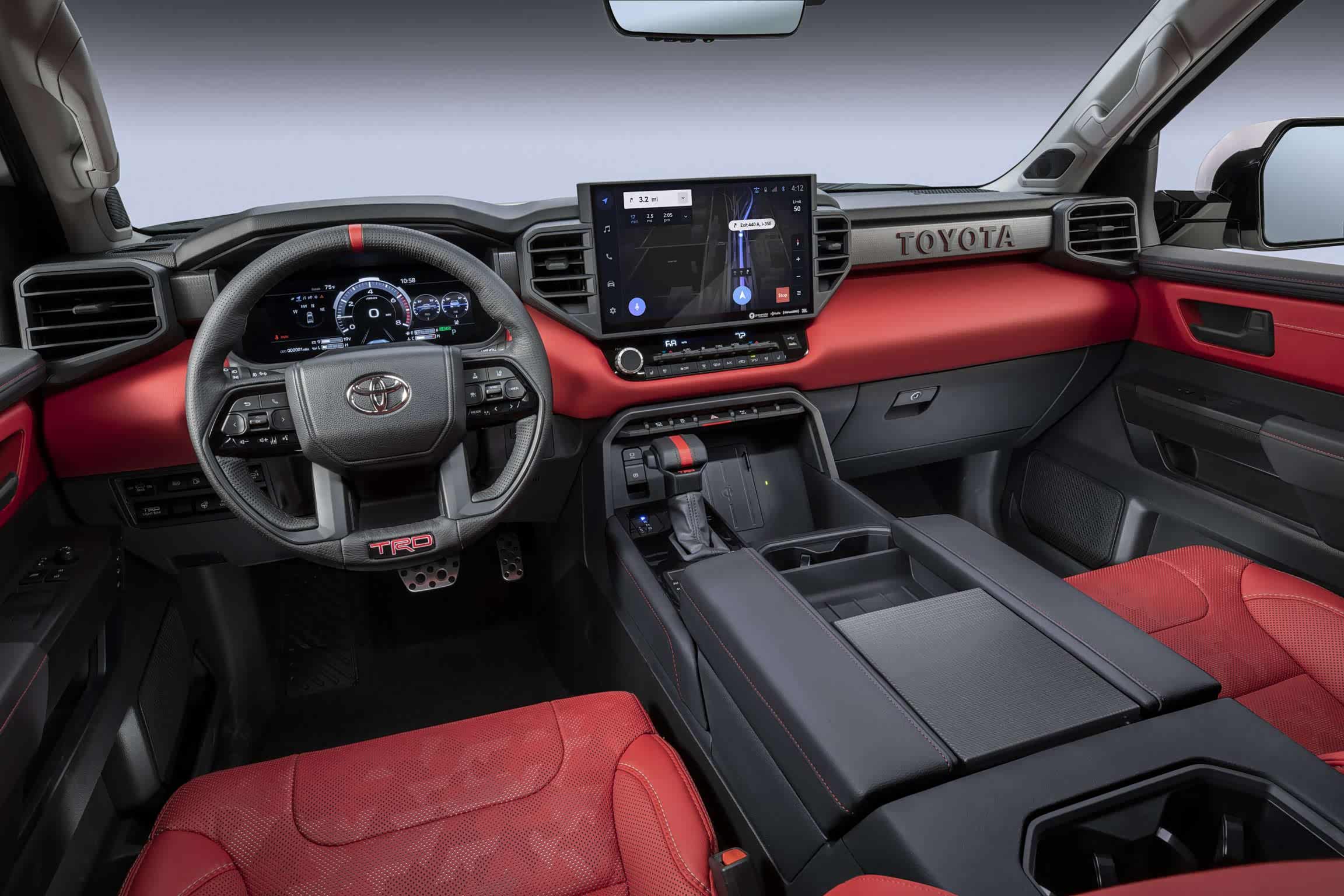 当然就细节上来说,全新Tundra延续了过去“数大就是美”的左右对称布局,高级金属饰板、软质塑料以及合成皮材质布满全车,深邃的中控台为笔记本电脑、手提包或其他日常装备提供了储物空间。并排的杯架和直立的无线充电系统让所有物品都能井然有序地放置,而全景天窗配置也是顶配车型才具备。在原装真皮座椅之外,TRD Pro版本的配色更具轿跑风格,同时具备“TRD Pro”字样的座椅刺绣。