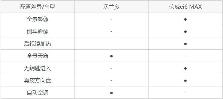 后备箱/行李箱容积:沃兰多的容积为109-1520升;荣威ei6 MAX容量为308升。通过以上的对比,我们可以看出,在后备箱大小方面,沃伦占优势;在车身宽度方面,荣威ei6 Max占优势。二者在空间方面各有千秋,均有各自的优点。