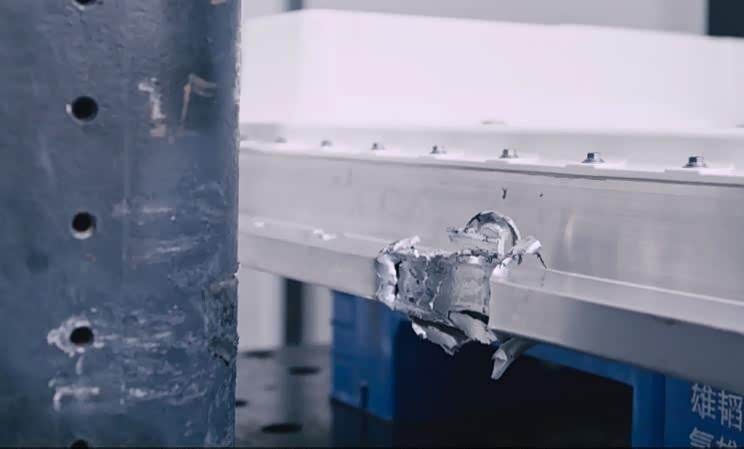 其次是挤压测试,如果车辆发生意外事故的话,动力电池很有可能受到外部的冲击,遭受强力挤压。如果电池安全性能不过关,就会发生爆炸、漏液等危险情况。