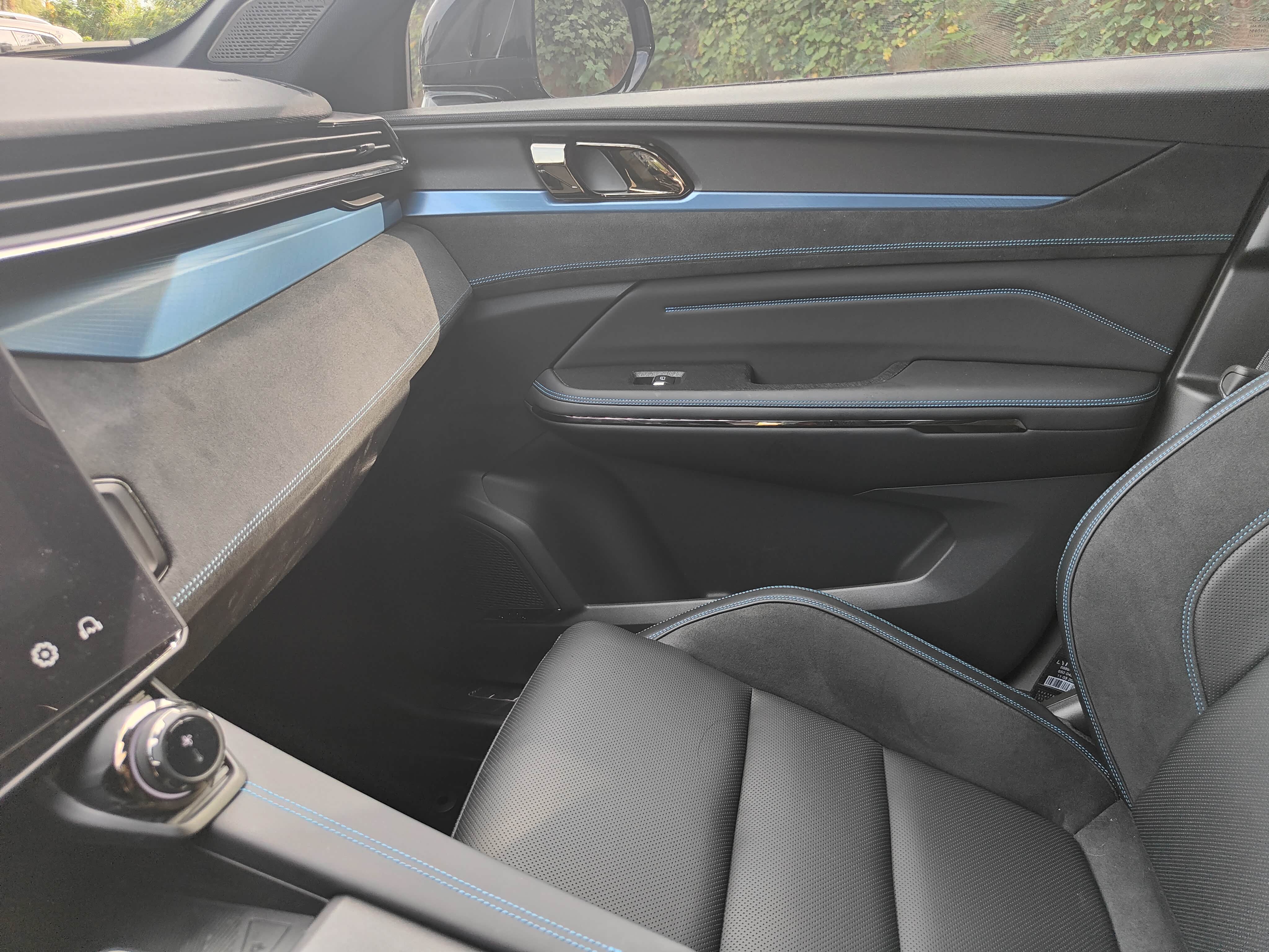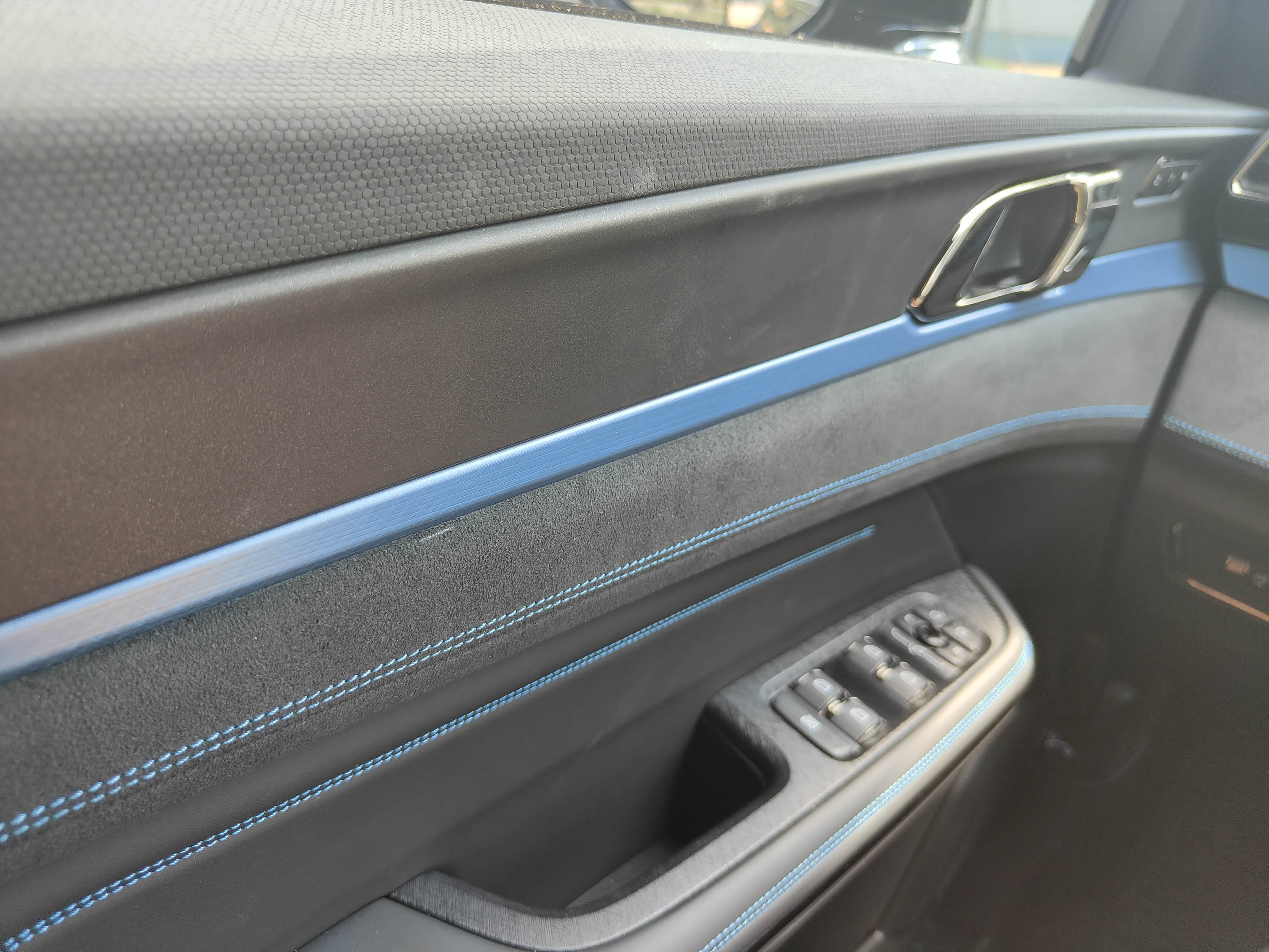 内饰方面,领克05 PHEV和普通05几乎一致。车内虽然都是这种全黑内饰,但材质和纹路却很高级,比如搪塑材质的花纹是专属的六边形设计,而包裹则是翻毛皮材质。车内饰条和缝线配上了与电力科技相关的“蓝色”饰条,只是这种蓝色特别一些。值得一提的是这个饰条是铝饰条,手感更舒服。