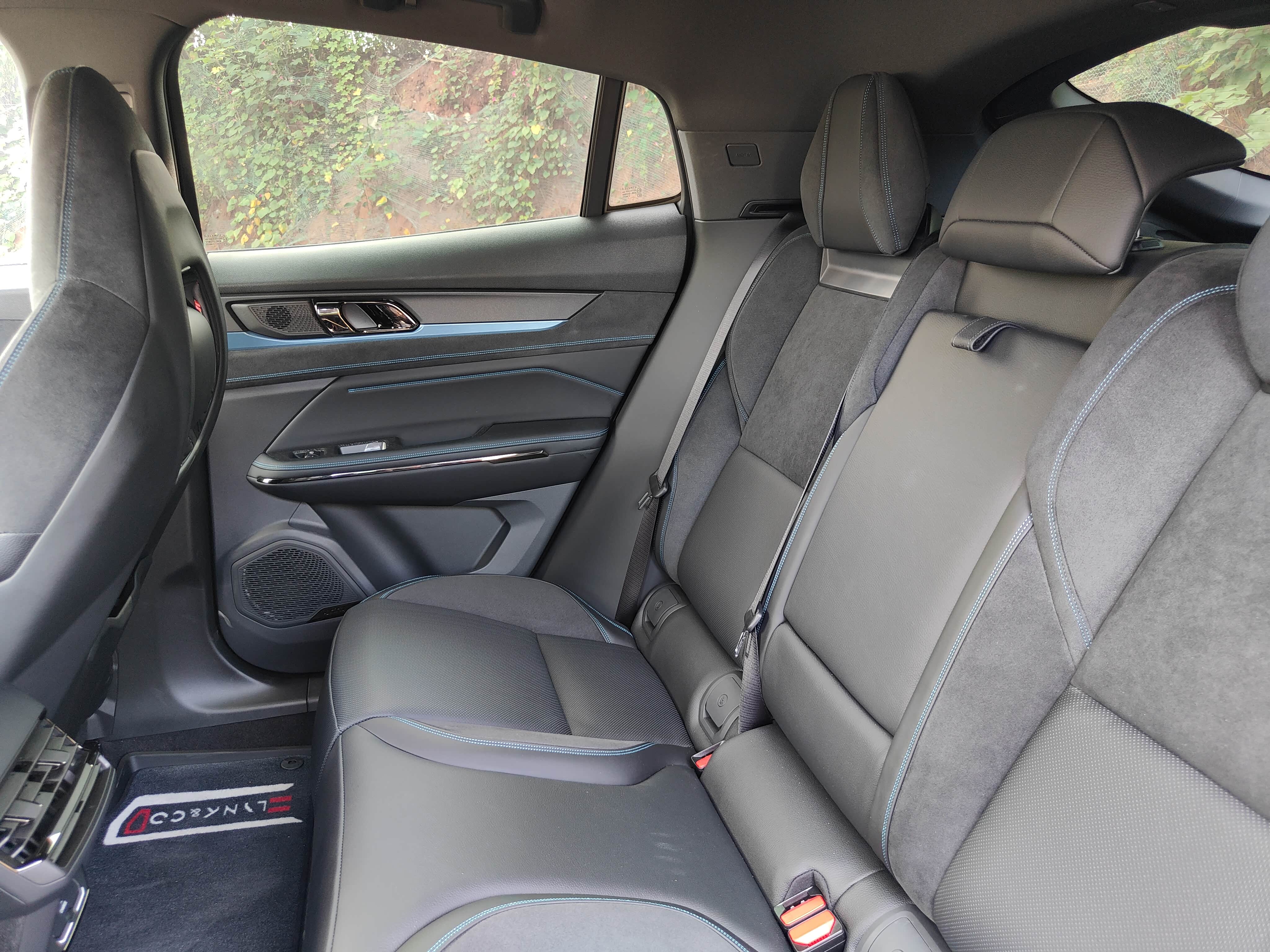 后排空间最大的变化是,领克05 PHEV的电池在地板下重新做了布置,不再是单纯的T型电池组。所以整个后排中央地台的凸起就不明显了,这让后排坐下三个人也没有问题。而后排腿部空间可以达到两拳左右,头部空间一拳多点,对于一款紧凑型SUV来说也是合格的。